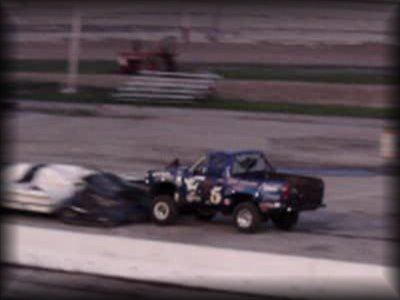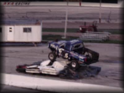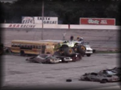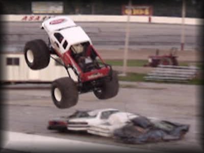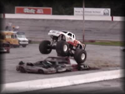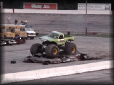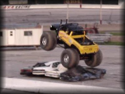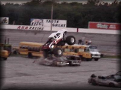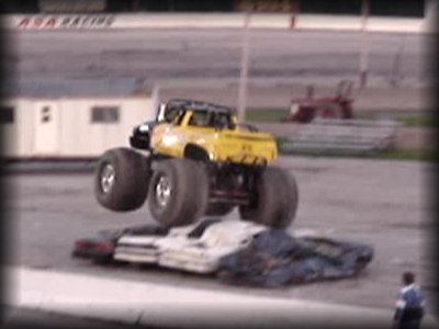 And now to finish out the first round of freestyle, it was time for Don King in Bearfoot!! King brought the truck up to the first set of cars and got the nose way up in the air!! Then Bearfoot brought the car up to the lone car set up for slap wheelies. Bearfoot launched it over the car, but wasn't quite able to get it into a wheelie. Bearfoot then attacked the near set of cars, again getting the nose up in the air!! King brought the truck back around, looking lost for a minute, but then it became apparent he was going for the set with the van in it, and he got some great altitude on the front on the initial hit and rode the truck on the back wheels all the way over the set!! King then brought the truck over to the frontstretch and let the horses loose in front of the crowd!! A great finish to round one!!