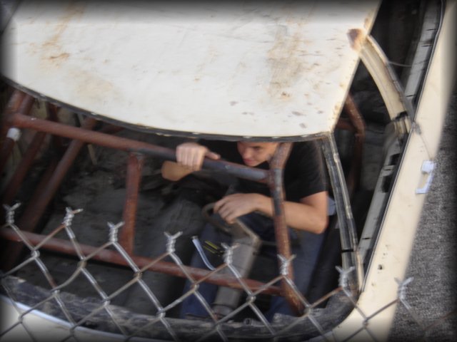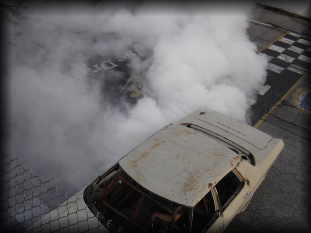 Another fun thing that went on before the Monster Trucks came out to tear some stuff up, was a guy in a beat up old car came out onto the frontstretch to burn some rubber and smoke the tires for the crowd. Unfortunately for him and amusingly for the rest of us, he was only able to get one tire to spin in the old boat of a car, but the crowd still got a kick out of it.