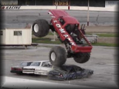 Time for the next truck from the Don's Monsters, Inc. stable, Born to Be Wild, driven by Larry Quick. Larry brought the truck out, and shot fire out of the hood pipes for effect, getting the crowd's attention. Larry made three passes over the different car sets, and apparently broke something on the last landing, as he would sit out the rest of the night. A disappointing showing from the Born to Be Wild truck, but you can't predict breakages.