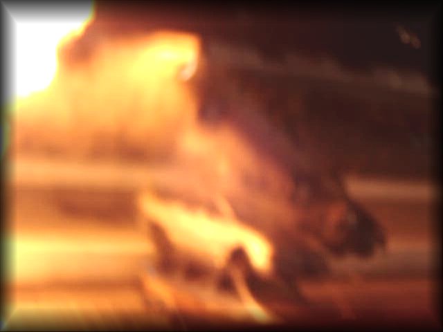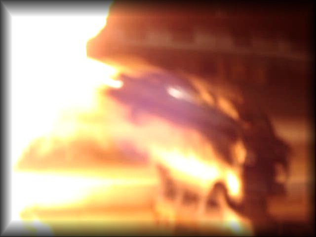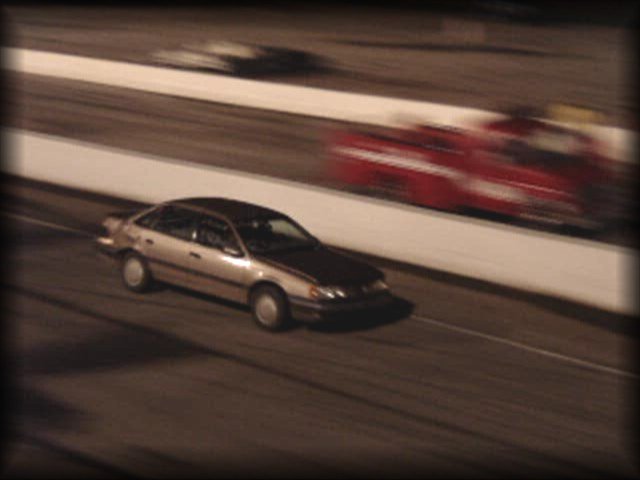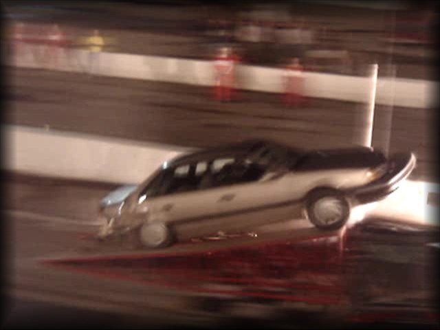 DR. DANGER'S DEATH-DEFYING JUMP After the completion of the trailer race, the track crew began setting up for Dr. Danger's third and final stunt of the evening. For you monster truck fans, you may remember seeing Brian Carson jump into a stack of cars, "the steel wall", I believe it was called. Dr. Danger would be attempting a similar stunt this evening, trying to jump over two minivans and a station wagon. There was one major difference however...Dr. Danger would be attempting this stunt in a completely STOCK early 90's Ford Taurus. Seriously, this car looked like it just came off the back part of a car dealership's lot. The car was not equipped with any kind of special safety features, as you may remember, Brian Carson would use a special car with rollbars, racing seat, and safety harnesses. Dr. Danger would attempt this stunt with only the regular seatbelt, just like you and I would use on the highway. Of course, you and I are not jumping into a wall of cars. You know how sometimes you get a feeling that something bad is going to happen? I could definitely sense that as we watched Dr. Danger head down into turn one coming around the track to build up speed. From our perch in the starter's stand, the stunt was to be taking place directly in front of us, and with the pyrotechnics set to go off when Dr. Danger hit the ramp, I was a little nervous about being too close to the action. As Dr. Danger roared down the frontstretch, taking the ramp at full speed, there was a giant explosion as the pyrotechnics went off, and the heat from the blast sent me ducking for cover. At the last second of the video footage however, you can see Dr. Danger smashing into the top van, and the rest is just the aftermath.