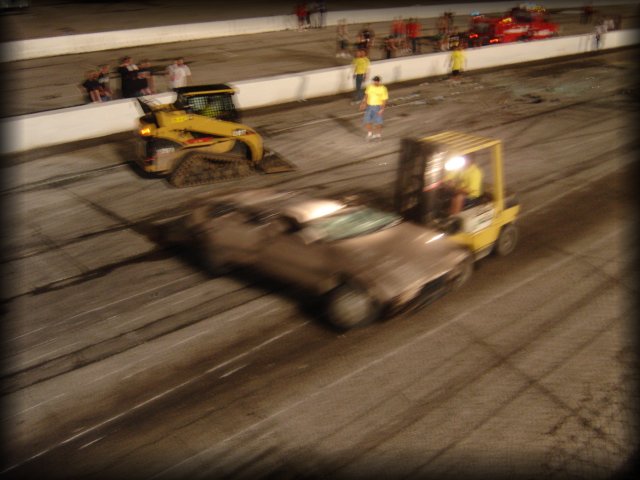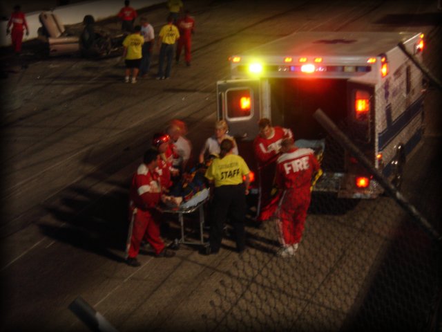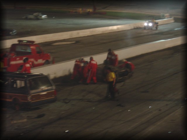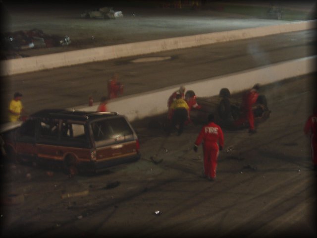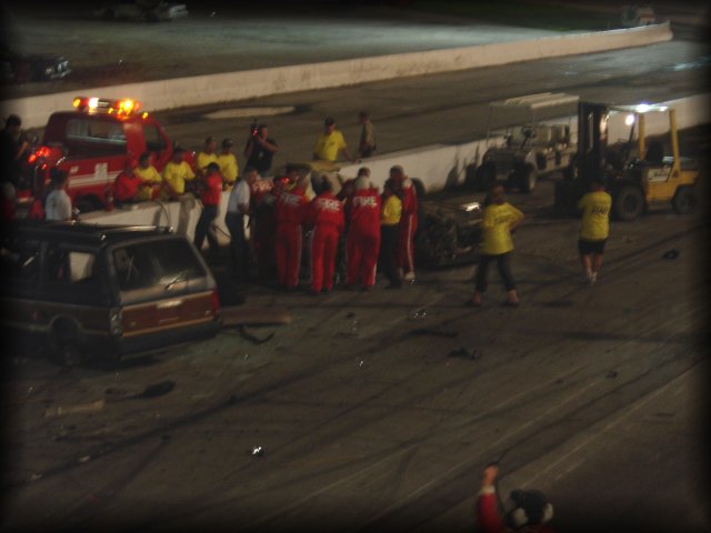 As I popped back up after the initial shock of the blast, the frontstretch was littered with debris and there was the Ford Taurus, upside down on the asphalt with the roof completely pancaked to the ground. My friend Eric Anderson, who attended the event with me looked at me and said, "I think we may have just watched a man die." Thankfully that would not be the case, but gazing upon the wreckage was absolutely bone chilling. The safety crews were on the scene quickly, and work to extricate Dr. Danger from the car began. A long delay would ensue as safety workers and EMT officials attempted to remove Dr. Danger from the wreckage, and the crowd (ourselves included) could only wait and pray that Dr. Danger would be ok.
