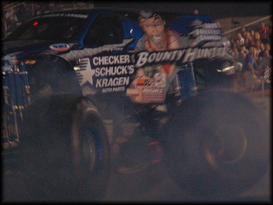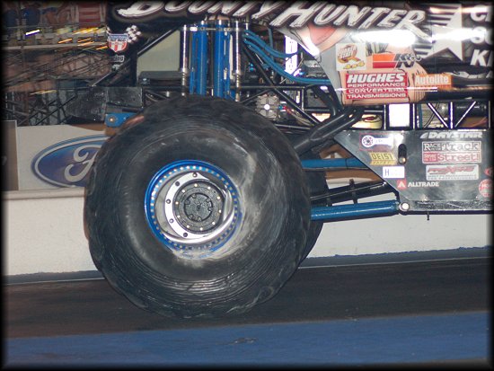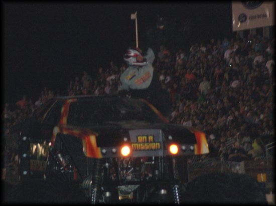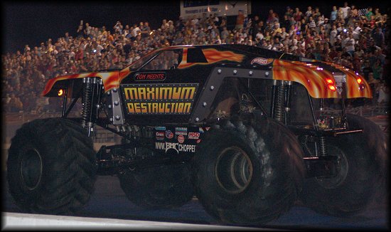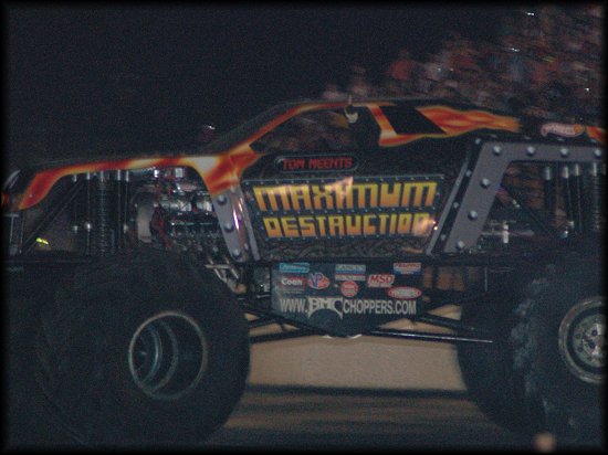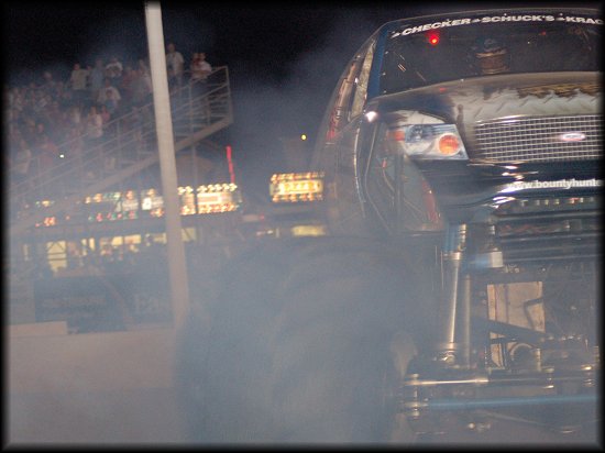 Next up was the Donut Contest, which put two Freestyle World Champions up against each other!! Jimmy Creten in Bounty Hunter and Tom Meents in Maximum Destruction. First thing we all must remember is they are doing this on a drag strip, so space is very limited. Jimmy was up first and as usual he put on an awesome display that excited everyone, to include the guy taking pictures. Jimmy came out of the pits, at a slow pace listening to the crowd roar at the appearance of Bounty Hunter. He drove down to the far end of the stands to start the donut show. Remembering that he is on a drag strip and has a narrow area to work with, it takes a couple times to do an awesome donut. He tries once and his rear wheels hit the concrete barrier as he is sliding, but he gets it going and puts on an great performance for the people on that side of the track. Jimmy came down towards the start and did donuts for the fans on the other side of the track. He did donuts one way, then donuts the other way. Jimmy went back down the track and started over. Great job by Jimmy and the crowd let him know how much they appreciated it!!