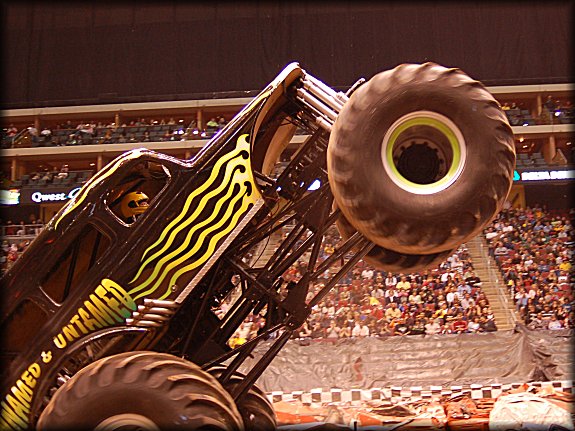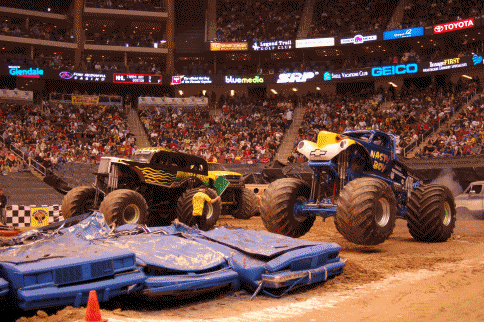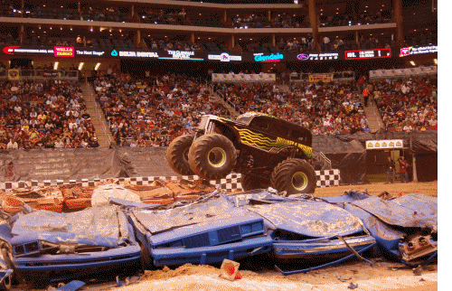 Leading off in Freestyle was Sam Sturges in the Unnamed & Untamed ride. Sturges got some great air of the carsets, making three hits, before his final, and most spectacular move of the night. Sturges hit the far sets of cars and got the truck completely vertical, landing on the back of the truck!! See the animation below for this awesome move!! A short, but very exciting Freestyle from the veteran Sam Sturges!!