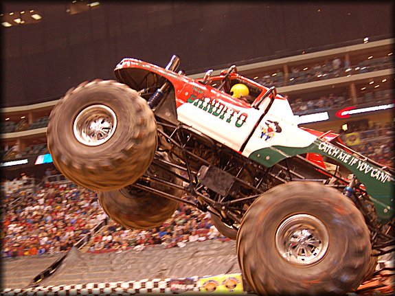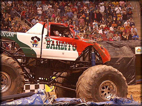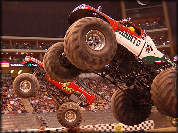 Time for some driver musical chairs, as Don King would be racing el Bandito, while Larry Quick stepped in to Bearfoot for this match-up. The two trucks both got a good jump off the line, and absolutely skied the trucks going over the cars!! On landing, el Bandito got out of shape, and the truck flipped end over end wildly!! Larry Quick was declared the winner in Bearfoot, while Don King fired up el Bandito and drove it out to the center of the floor, where he popped out the window as the crowd cheered for his wild ride!!